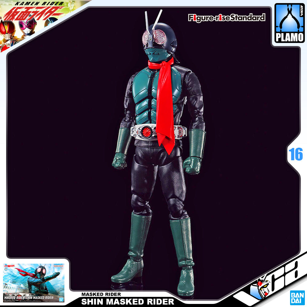 Kamen Rider himself from the 50th anniversary project "Shin Kamen Rider" joins the "Figure-rise Standard" model-kit lineup from Bandai! The visuals for this work were thoroughly redesigned to accurately express all the different details and textures of the suit, and the kit also has a wide range of motion when completed. Clear parts are used for his compound eyes, and the hair spilling out from under the back of his mask and the skin visible in the gap between the mask and the suit are also carefully represented. The leather texture of his bodysuit is achieved through special processing, and the chest part is divided into parts, to give a realistic finish by simple assembly. An extra finish is given to his belt and antenna to reproduce their metallic texture, and two sets of hands are included: open hands and gripping hands. Two types of scarf are included: one that's hanging down, and another windblown scarf that can be adjusted for dramatic posing! The included Figure-rise Effect base can support the completed figure in just about any dynamic pose. Order this iconic hero for your own collection today!