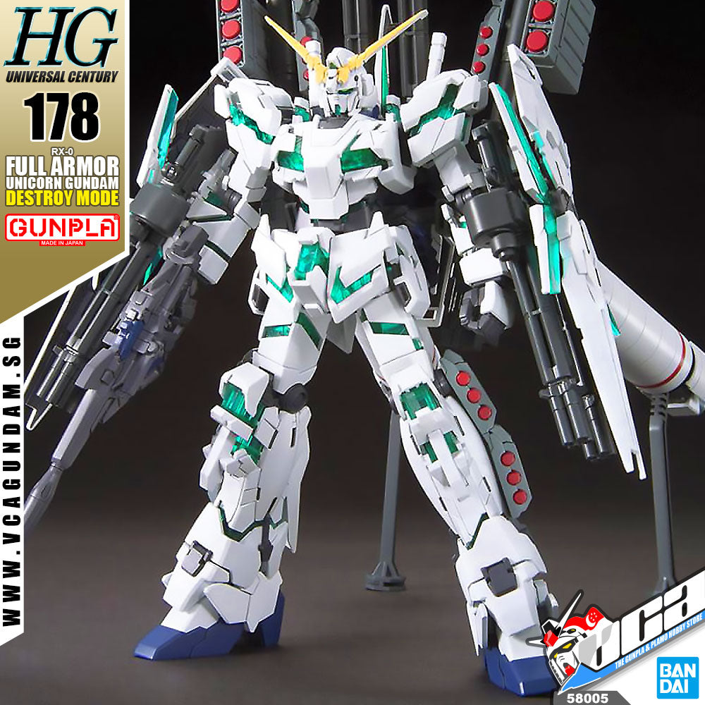 You absolutely do not want to get the Full Armor Unicorn Gundam in Destroy Mode angry at you! It comes with enough armaments to outfit a small army: two hyper bazookas, the Beam Magnum, four Beam Sabers, two Beam Saber blades, two anti-ship missles, two grenade launchers, four six-part hand grenades, six Beam Gatling Guns, its shield in stored state and three expanded sheilds, two large boosters, a rifle handle, and two gripping hands. Whew! It's posable after assembly, and comes with foil stickers for markings; instructions are illustrated. Don't miss out on this ferocious beast!