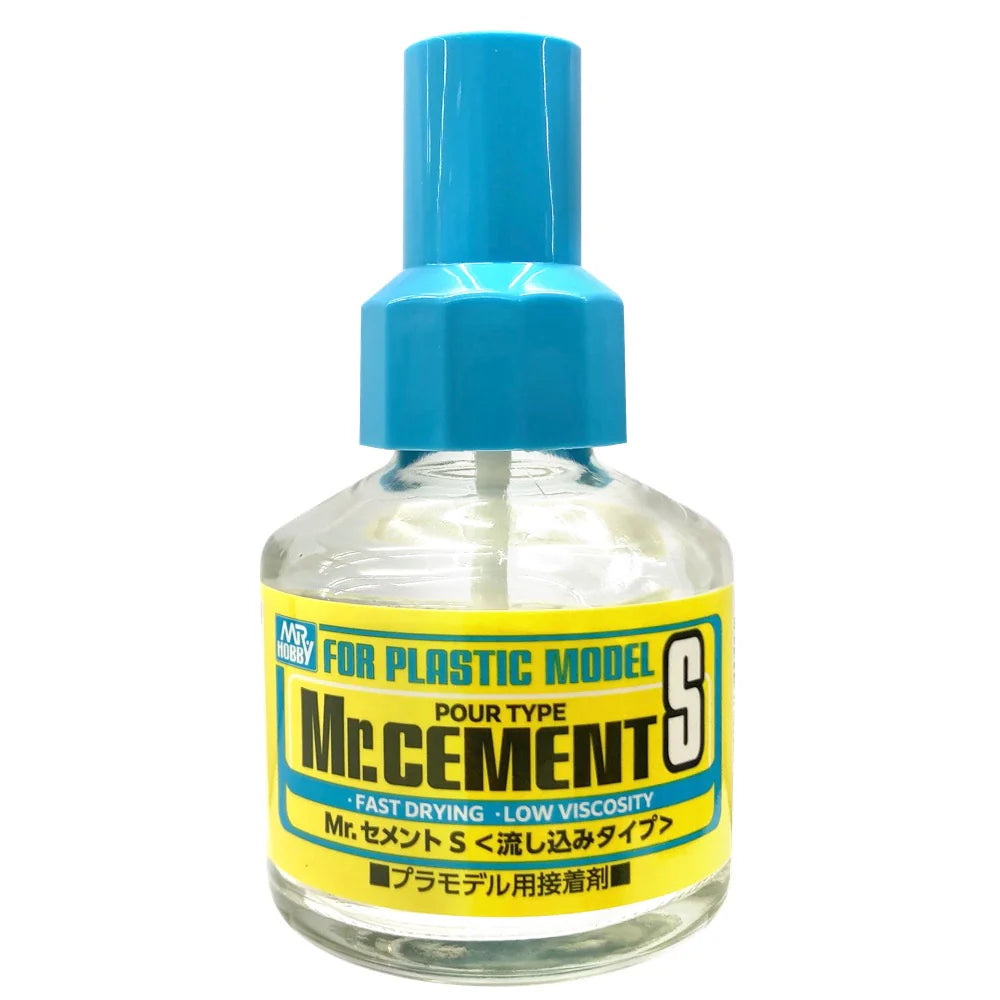 Mr. Cement S is a "BRUSH ON" type low viscosity cement. It dries faster than MC124/MC127 Mr. Cement, so it is suitable for attaching fragile pastic parts together quickly. You must put together the plastic parts, and then brush on this cement on the gap between the two parts.