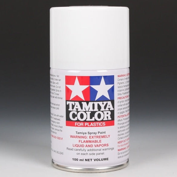 TS These cans of spray paint are extremely useful for painting large surfaces. The paint is a synthetic lacquer that cures in a short period of time. Each contains 100ml of paint, which is enough to fully cover 2 or 3, 1/24 scale sized car bodies. Tamiya spray paints are not affected by acrylic or enamel paints. Therefore, following an overall base coat, details can be added or picked out using enamel and/or acrylic paints. By combining the use of...