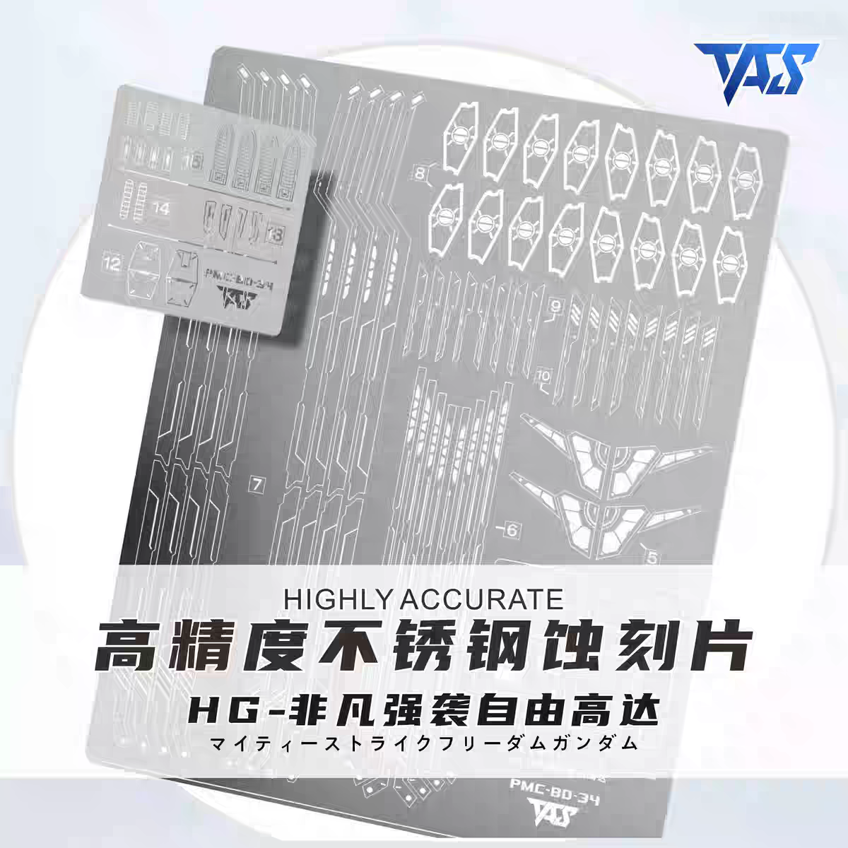 The TAS HG Mighty Strike Freedom Gundam Etching Parts is an aftermarket upgrade kit designed to enhance the detailing and aesthetics of the HG Mighty Strike Freedom plastic model kit. These etching parts are made of fine metal sheets, laser-cut to provide highly intricate details that cannot be achieved with standard plastic parts.